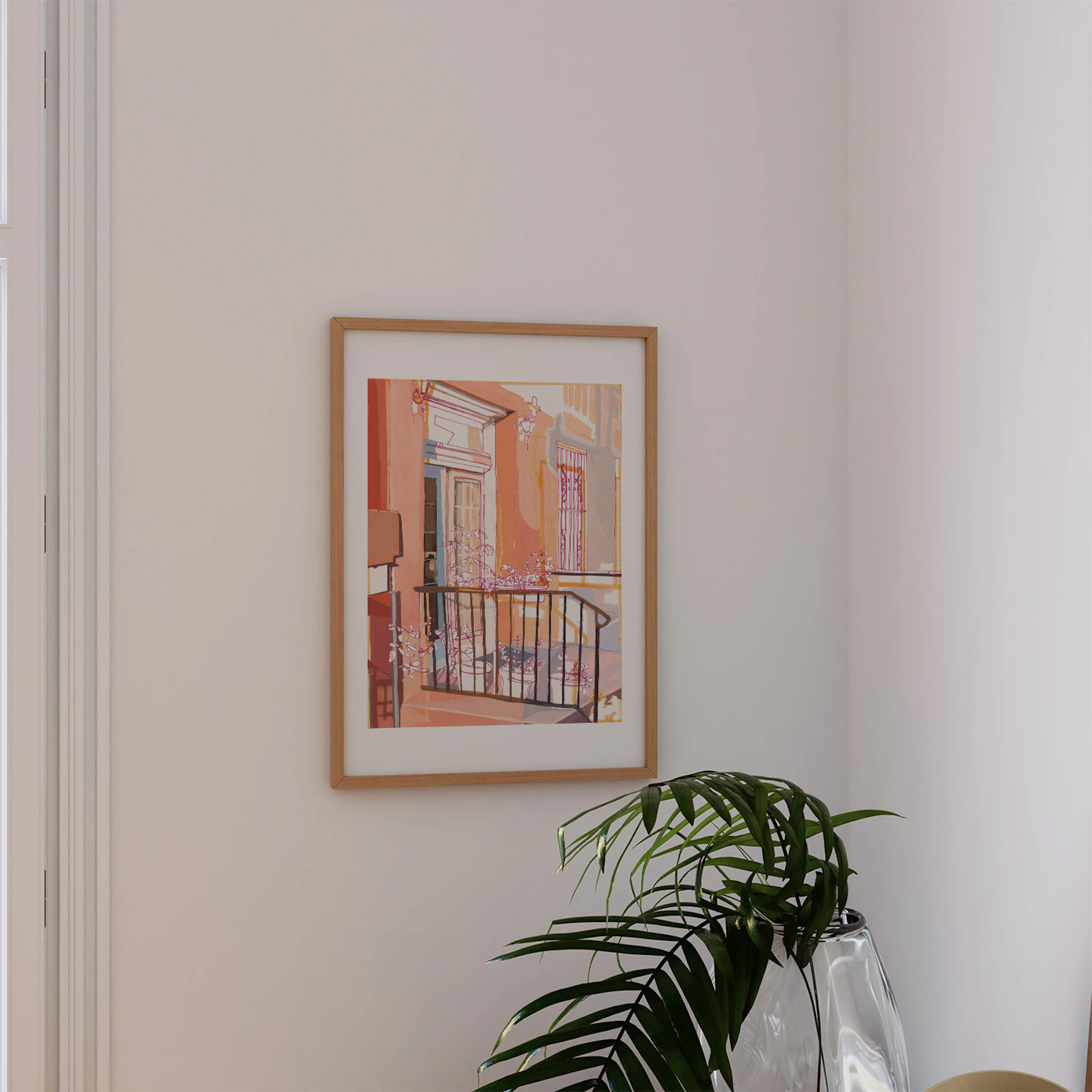 This still life cityscape features a Brooklyn stoop with potted plants during golden hour, complete with warm orange and pink hues. By Anissa Riviere.