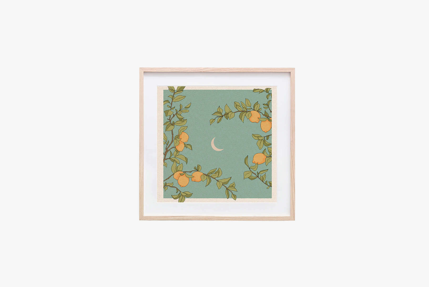 Part of a collection curated by Bon Femmes, the Lemon Tree Art Print by Cai & Jo showcases a blue sky and gorgeous crescent moon framed with ripe lemons, perfect on its own or as part of your growing gallery wall.