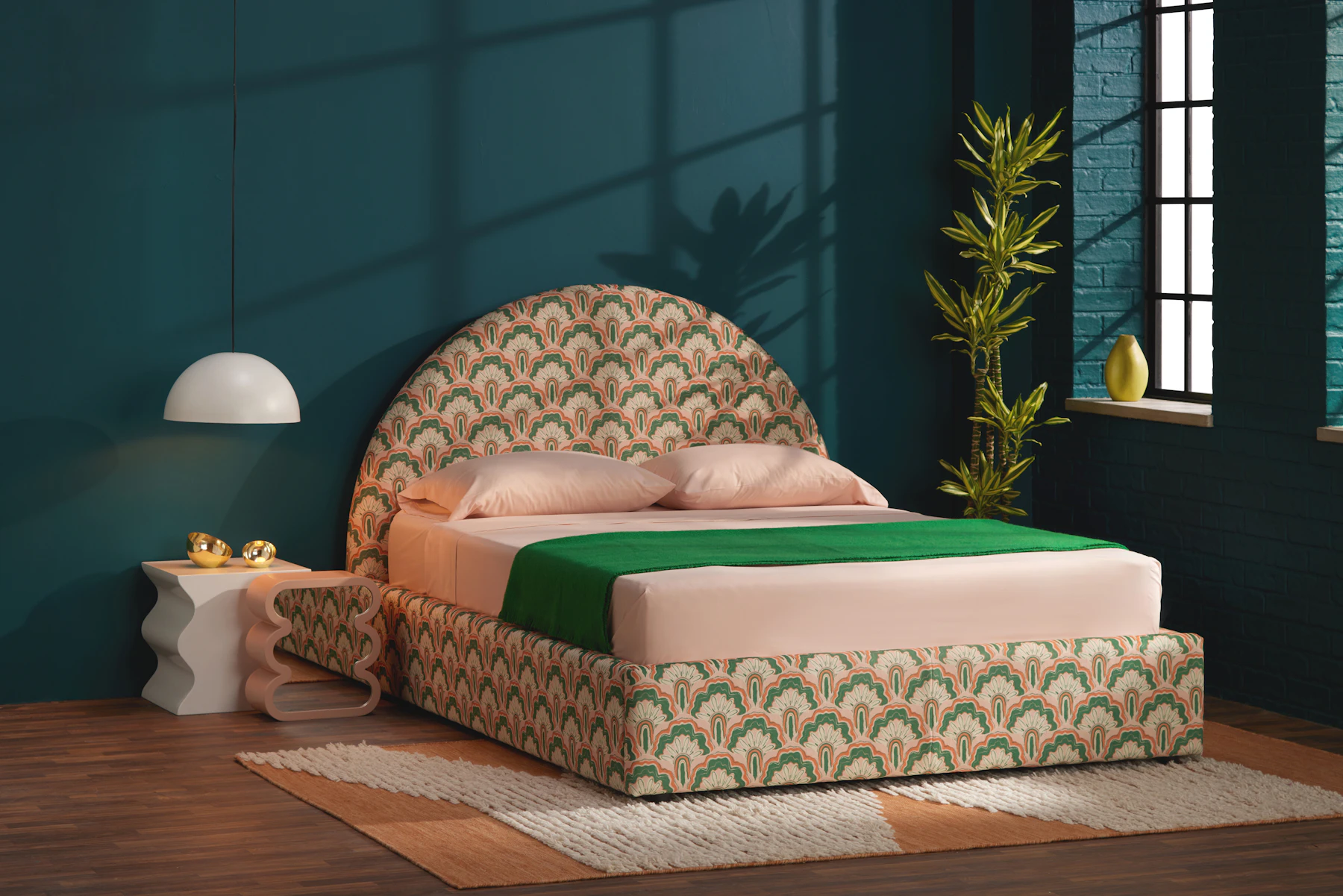 Bringing bold, modern style straight into your bedroom, the Dania’s concealed peg legs and low frame add to the cozy vibes while the large circular headboard puts the Art Deco inspired Deco Peacock fabric on full display.