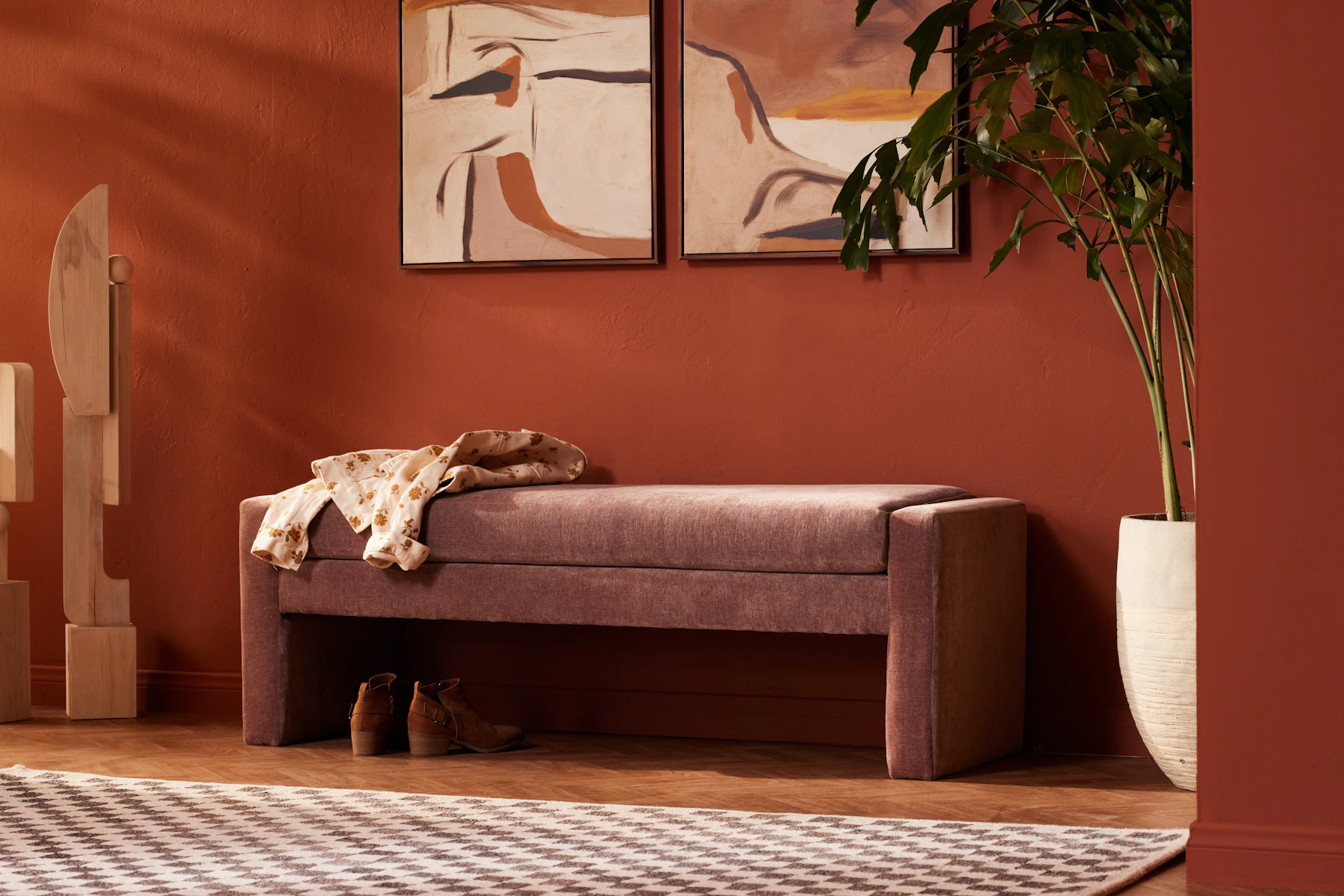 Need a place to take a load off or to quickly throw on some sneakers before heading out the door? This modern option is sure to fit the bill with its cozy seat and fully upholstered frame.