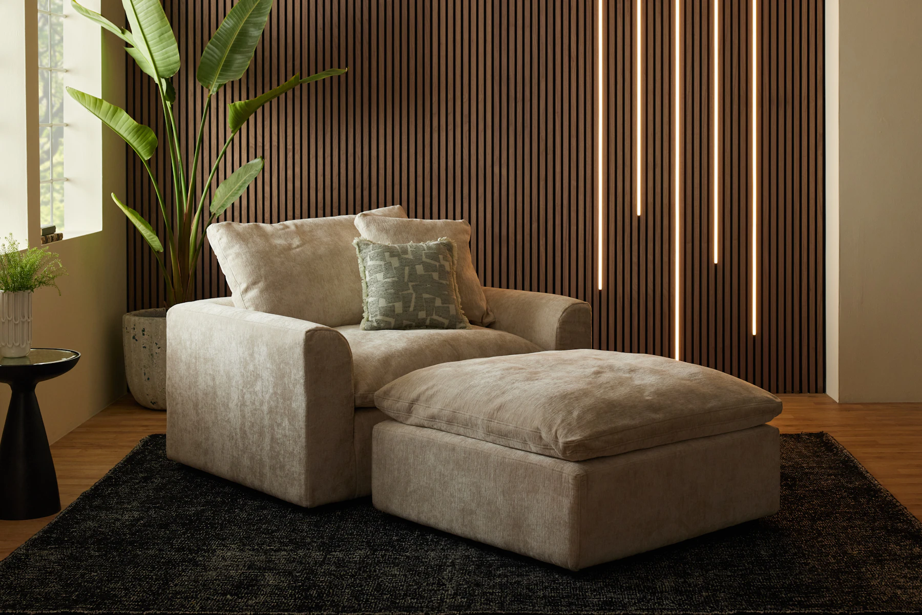 Bridging contemporary elegance with nestled comfort, the Bryant Chair and a Half encourages you to stretch out on its sloped arms, pillowed back, and ultra-deep seating, while the matching ottoman is perfect for kicking your feet up or serving as a makeshift coffee table, offering a contemporary yet highly adaptable piece.