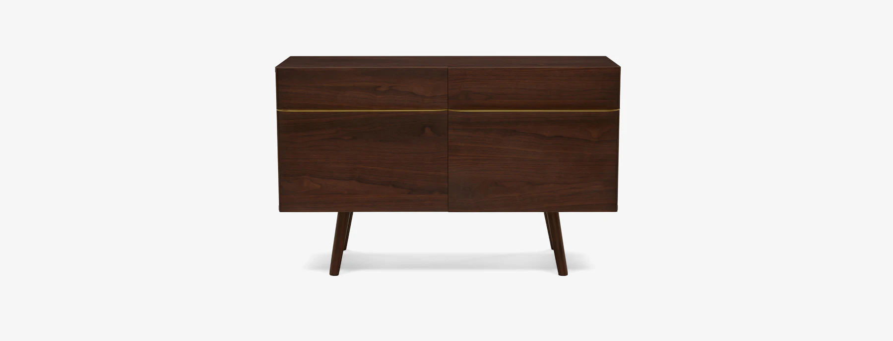 Combining sensibilities from both MCM and modern styles, the Nash showcases a dark Walnut wood frame (natural whorls & all!), tapered legs, and flattened brass door pulls. Does storage get more stylish than this?