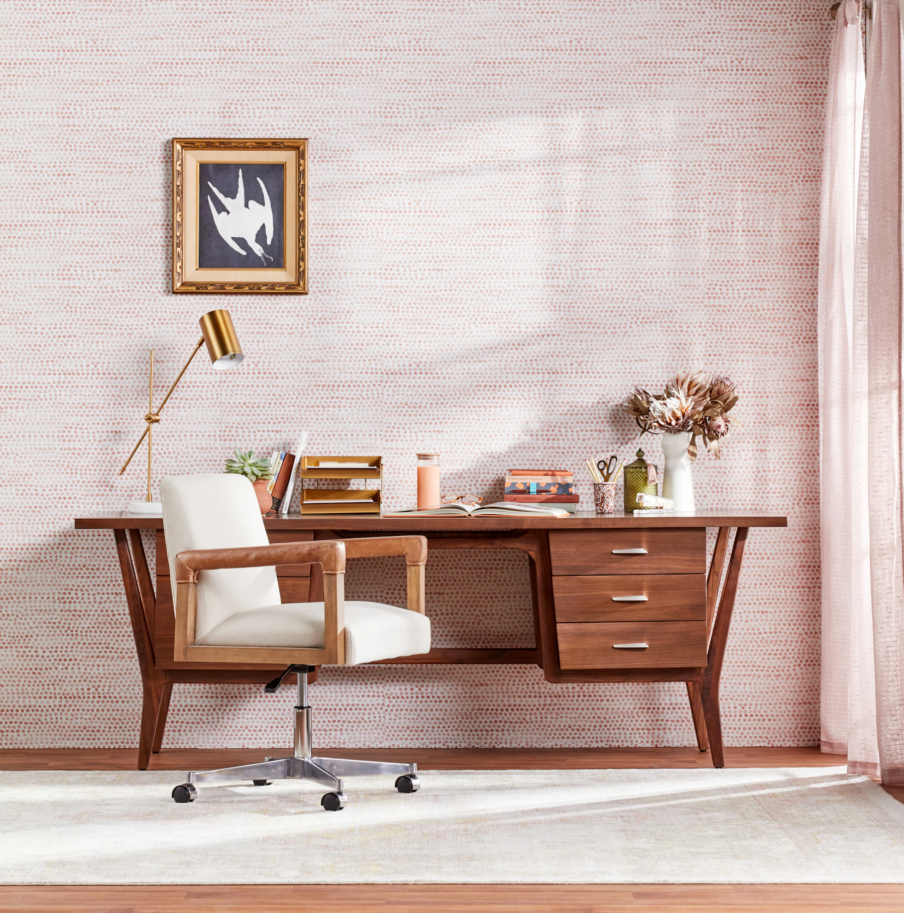Pull up a seat with this contemporary office chair, with its squared, yet slim leather-wrapped oak arms that frame a plush off white seat atop an adjustable wheeled base.