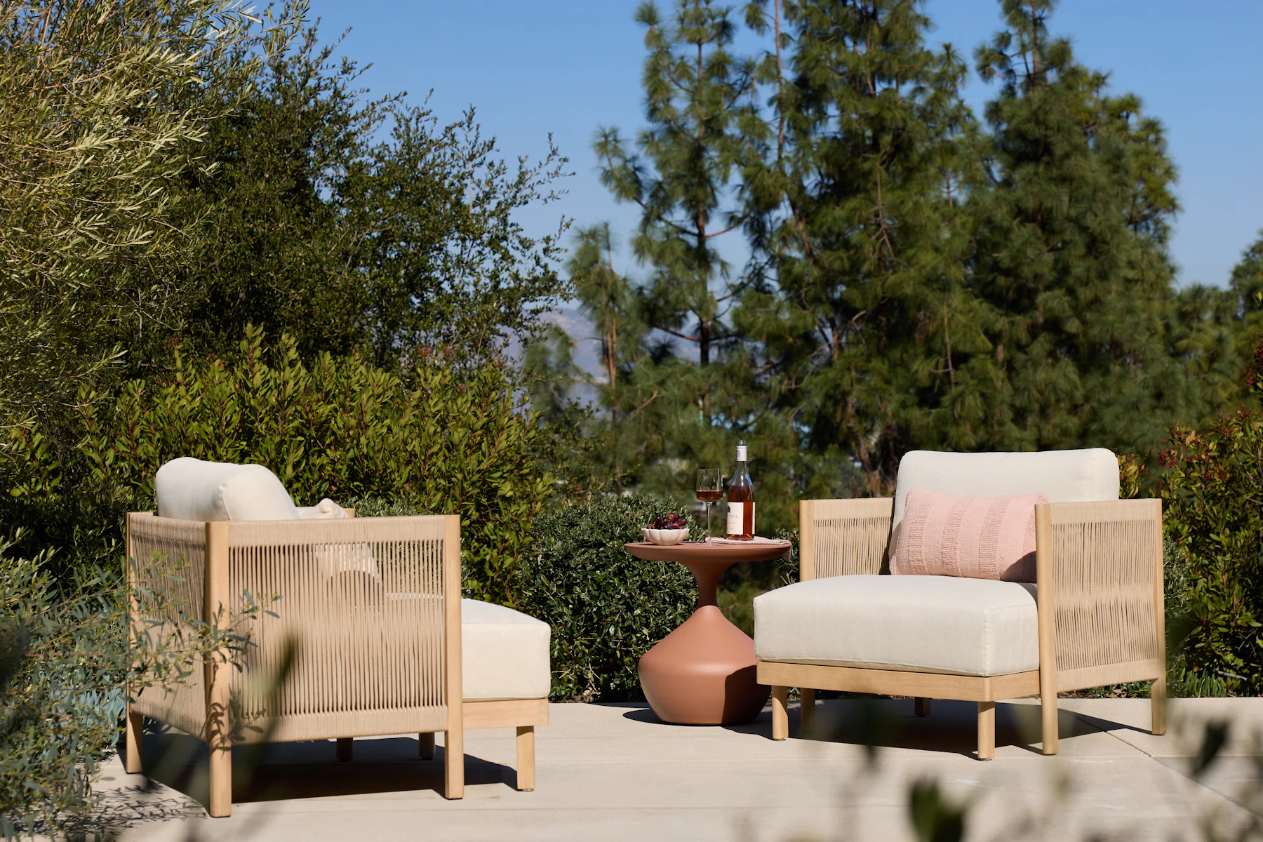 Crafted with FSC certified eucalyptus wood, accented with woven rope detailing on the arms and back, and topped with cozy cream cushions, the Cruz is the perfect choice for backyards and balconies alike.