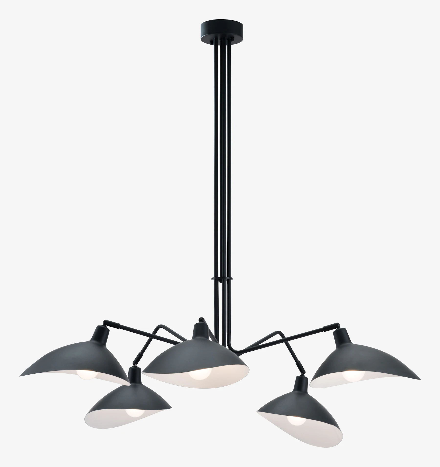 Adding a bit of intrigue to any room in your home, the Juno Chandelier features black scoop-like shades that rotate up, down, and side to side to throw light exactly where you need it.