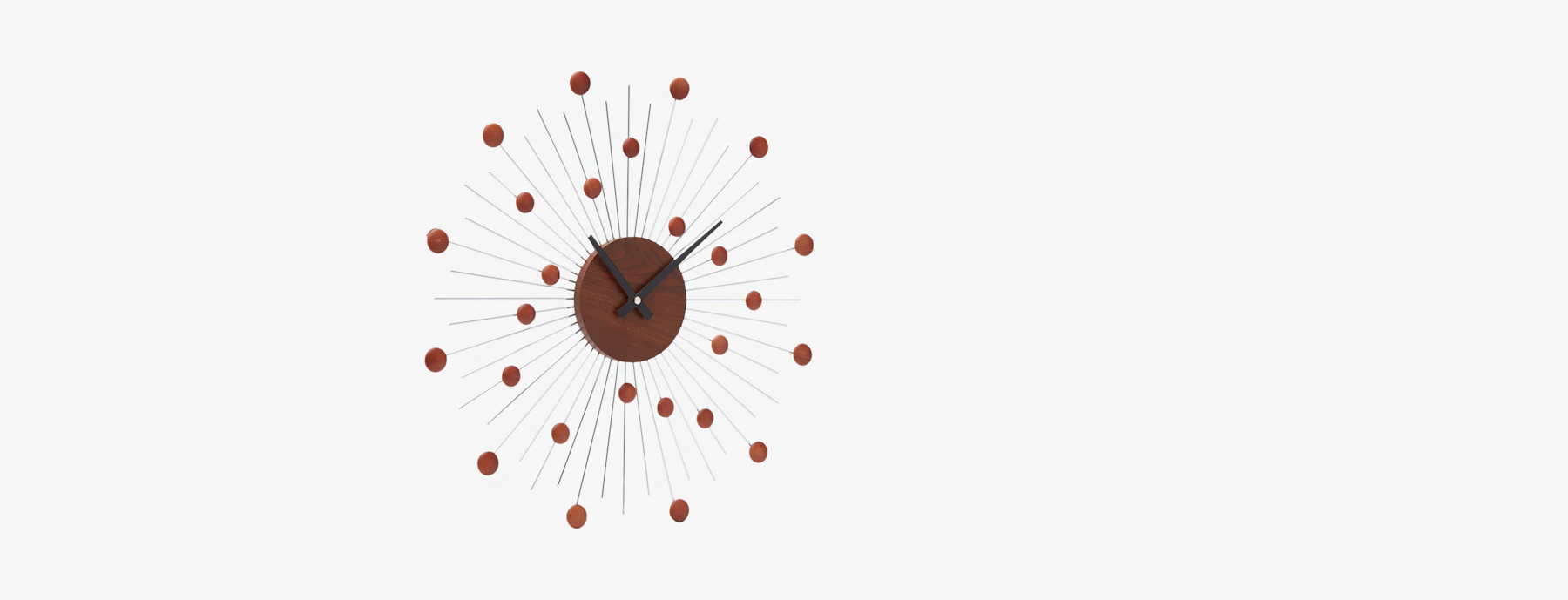 Tell time atomic style with this Mid-century explosion of natural wood grain and sleek metal that makes a big statement in a small package.