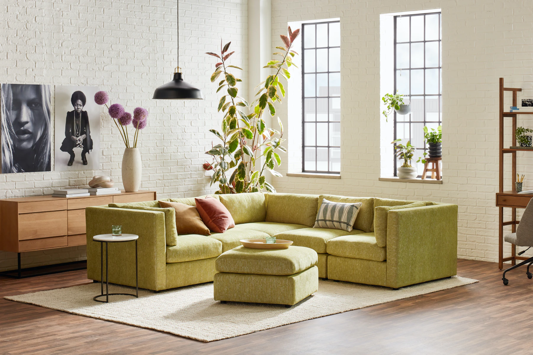 Sure to be the contemporary cornerstone of your living room, the Daya showcases clean lines, concealed peg legs, and plump cushions with a higher back and armrest. Comprised of two single arm chairs, two armless chairs and one corner chair for the ultimate place to relax.