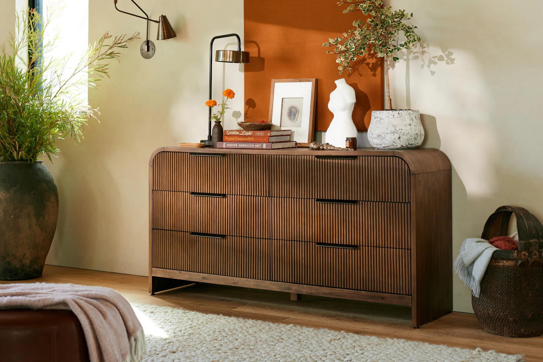 Use it as a companion in your bedroom with your matching Adele Nightstand and Cabinet, or even in the dining room to store flatware and serving supplies, the Adele’s six spacious drawers with burnished black handles are sure to supply you with more than enough room to keep your essentials close at hand.