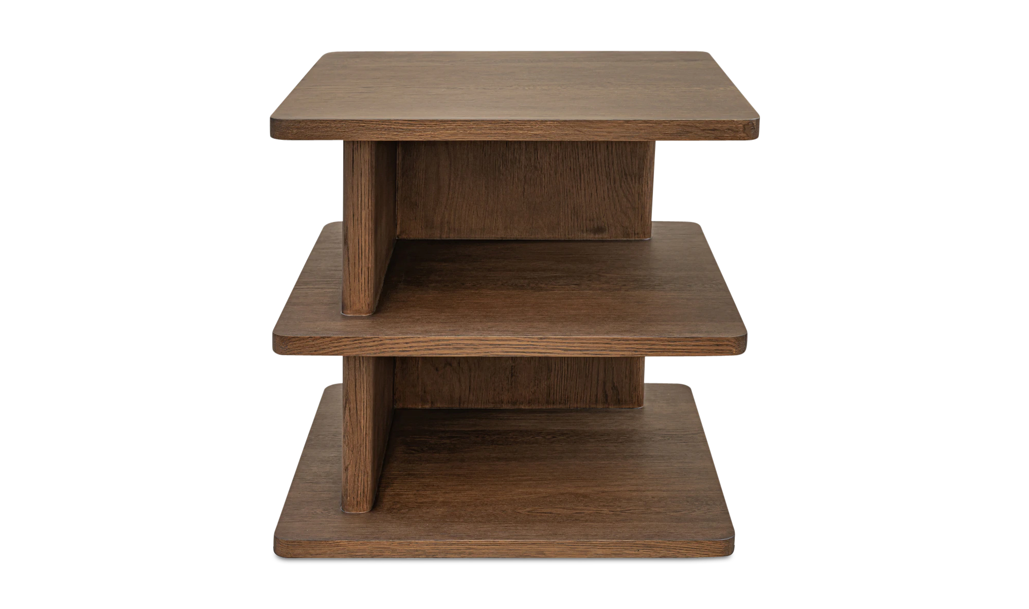 Crafted with an oak veneer, with vertical support and a bullnose edges, this end table features open storage beneath the table top for all your storage and display needs.