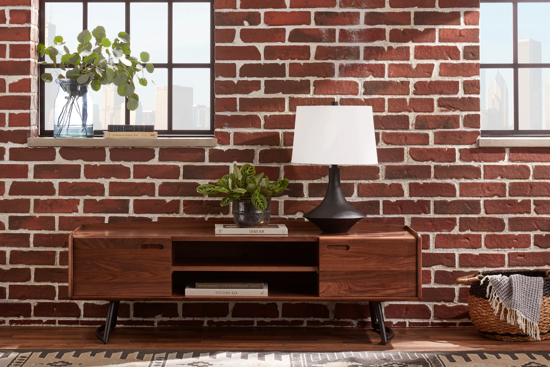 The perfect blend of retro and modern styles, the Bellamy showcases natural wood grain on its spacious table top, shelving and cabinets. Conveniently placed cord management holes allow you to keep your entertainment systems tangle free, while the curved, black legged frame gives the illusion that this console floats on air.
