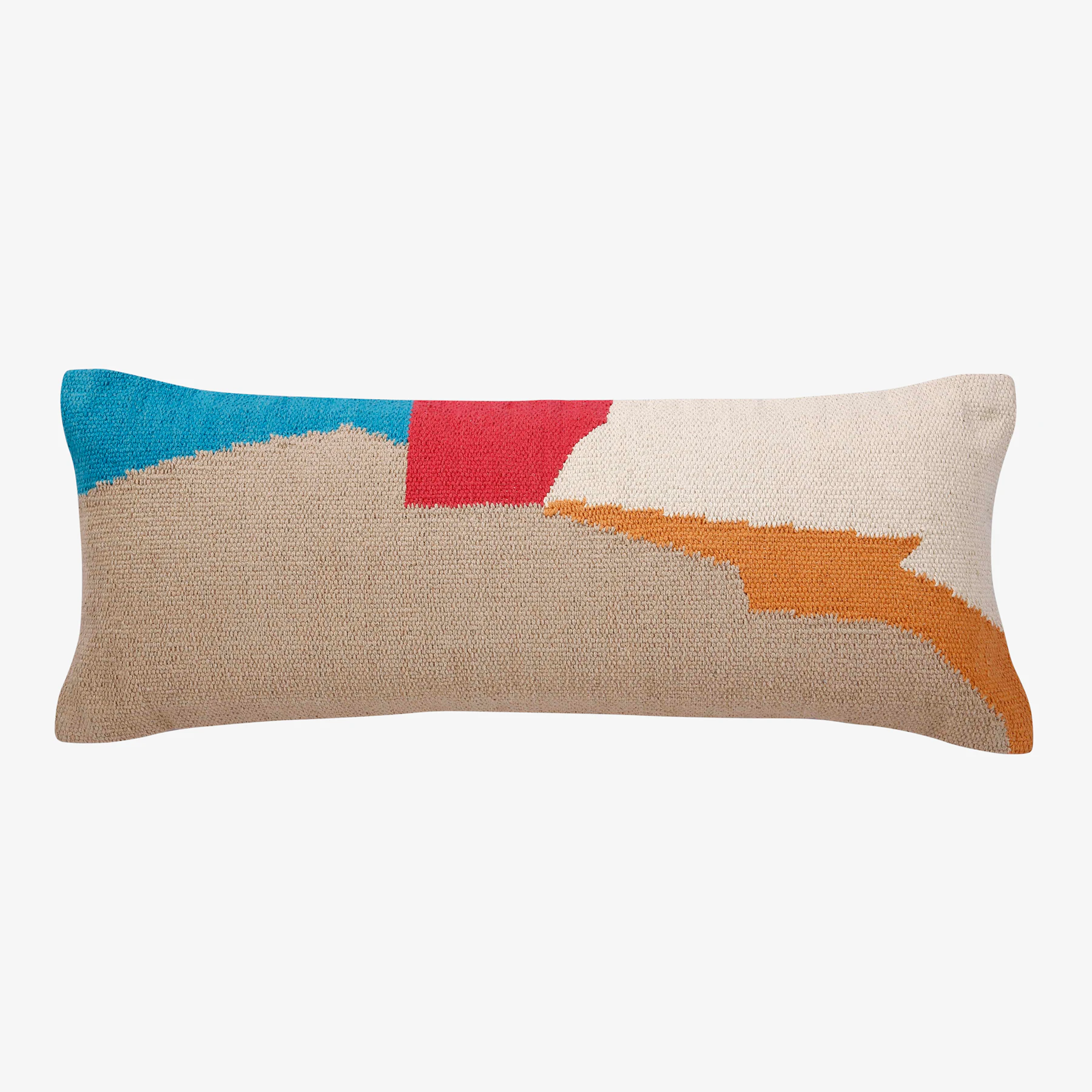 Inspired by the landscape of a Himalayan city, the Jerica Lumbar Pillow features bright pink, muted orange, and cool blue colorblocking against natural beige for the ultimate accent piece.
