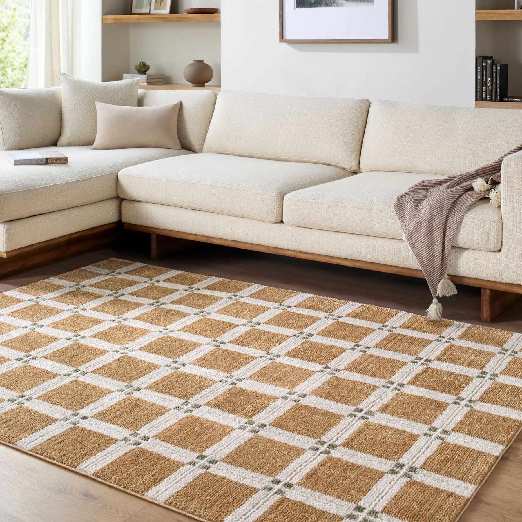 Add timeless pattern and cozy texture to your floors with a modern grid design in warm light brown accented with off-white, light gray, and olive tones. It's the perfect balance of classic charm and contemporary style.