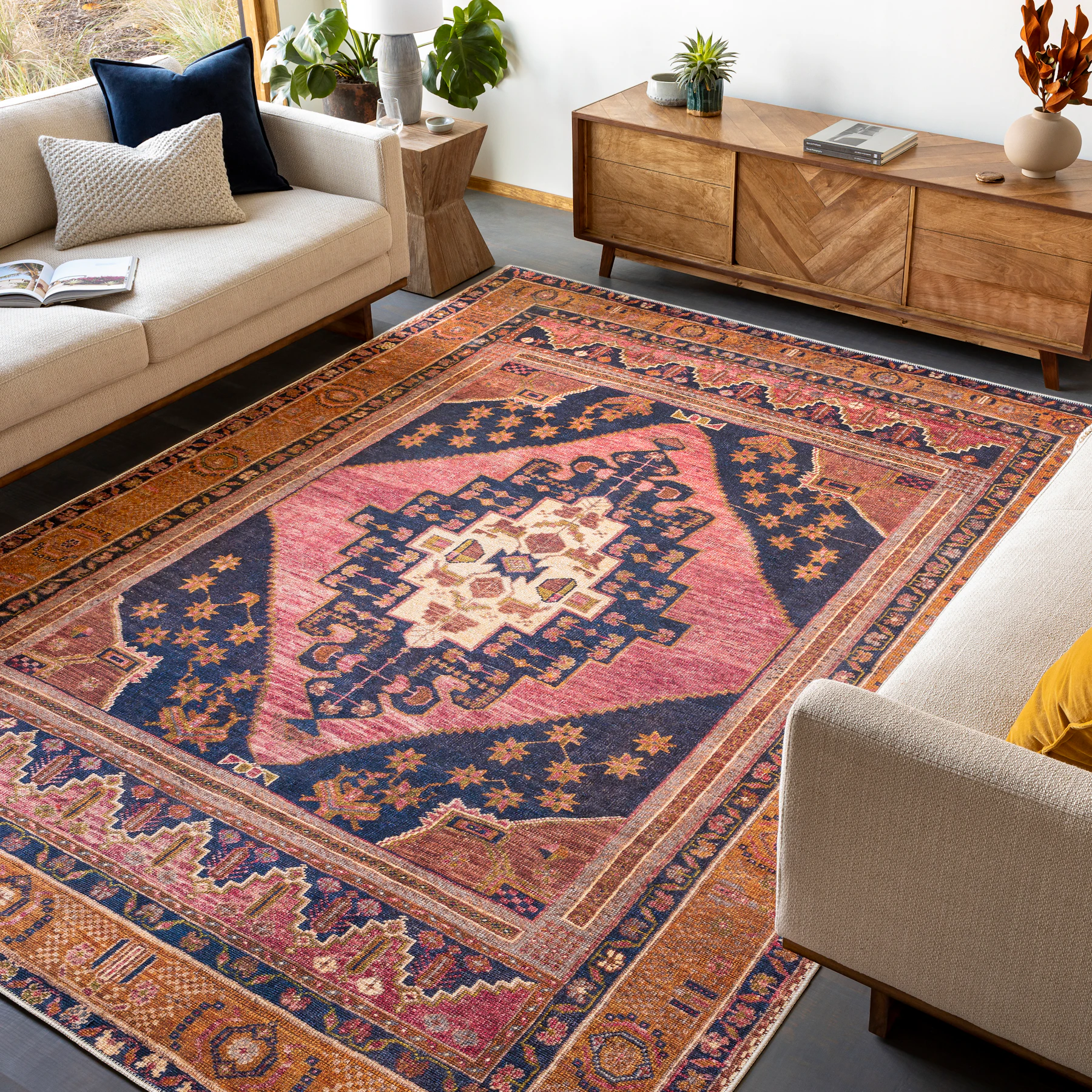 For those who love bold, vintage inspired designs the Mara Rug is right up your alley. It's dark blue, rose, and burnt orange colorway add fun hues to your floors, and it's machine washable, so you never have to sweat another spill.