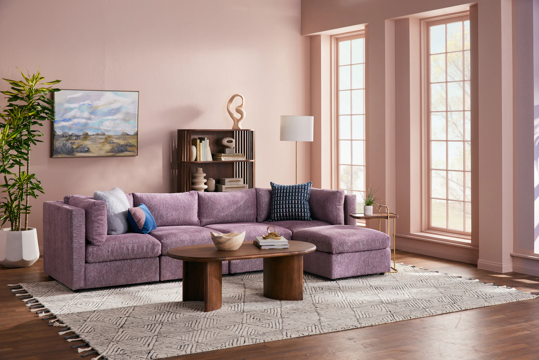 Perfect for movie marathons, hosting friends and family game nights, this grand sectional consists of 2 single arm chairs, 2 armless chairs, and an ottoman clipped into place. The Daya’s clean lines, plump cushions, concealed peg legs, and high arms and back provides a comfortable and functional place for everyone!