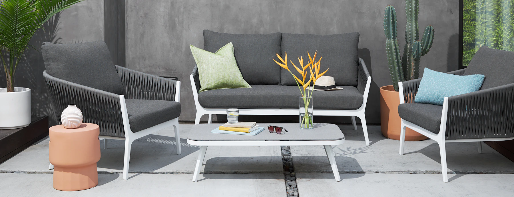 Modern design enthusiasts, your outdoor living space would like to give you a big thank you for amping up its wow factor with the Rizzo Outdoor Collection. Designed as a four-piece set, including a two-seater cushioned sofa, matching armchairs and perfectly curvy coffee table, this chic set adds an element of mid-century style to any deck, patio or backyard lounge spot that friends and family will enjoy for years to come.