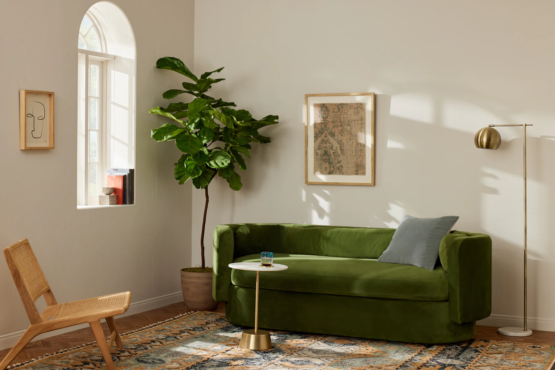 The perfect blend of retro and modern glam, this curvy sofa showcases a wraparound arm and back with an oval set and pillowed back for a seat that looks as good as it feels.