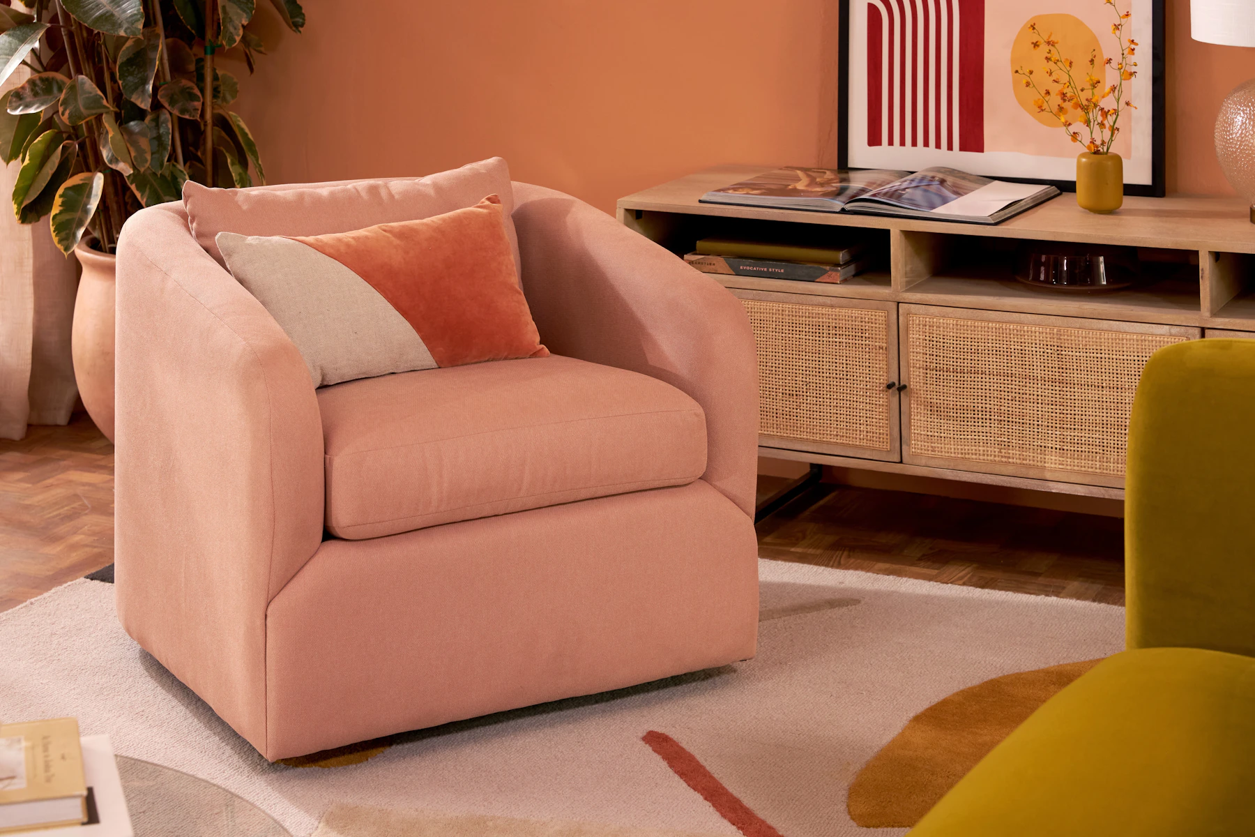 A contemporary update to the swivel arm chairs of the ‘70s, the Amelia will have you turning heads from every angle.