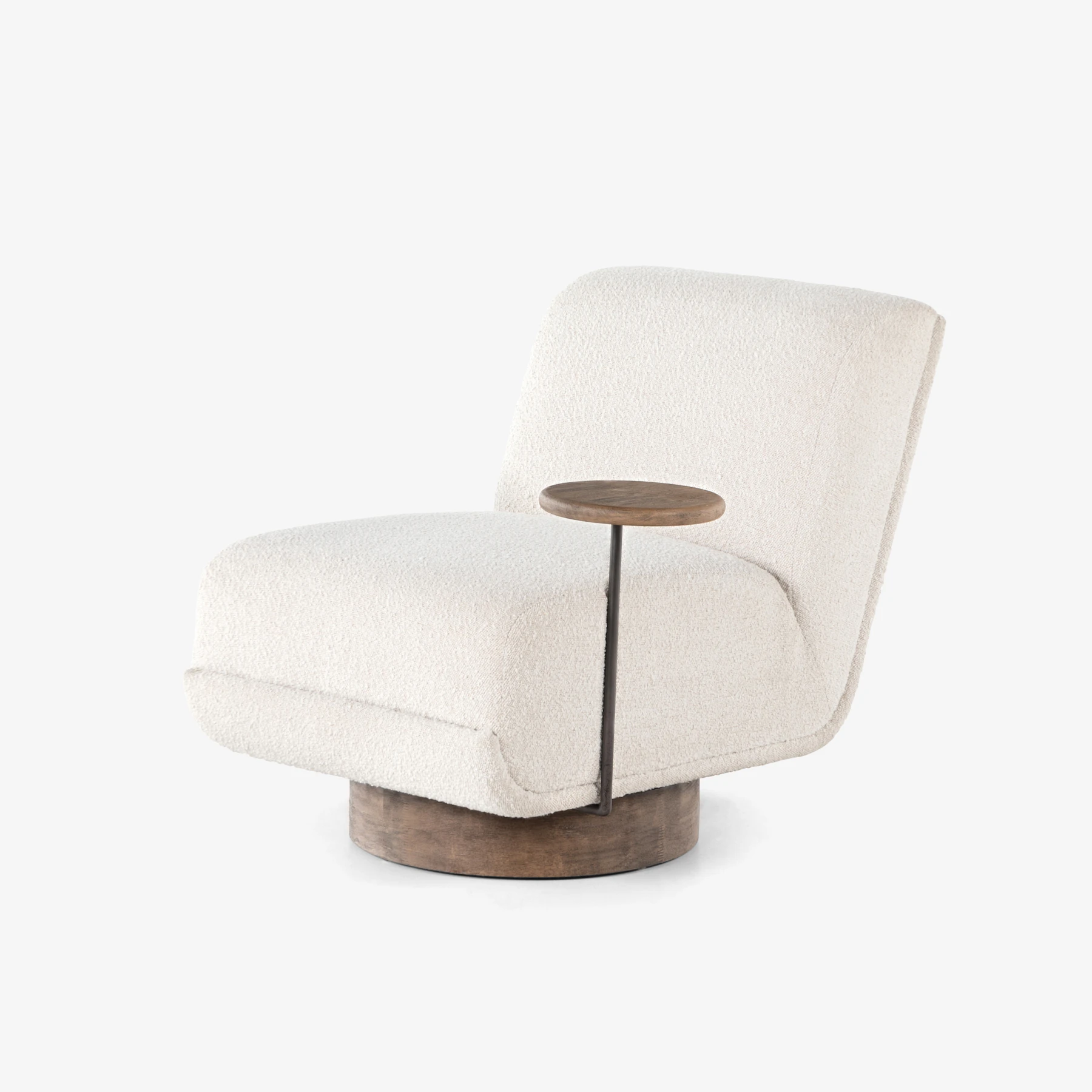 The Hemingway features a chunky, bouclé inspired fabric, a rounded parawood swivel base that has been wire brushed for some subtle vintage vibes. The detachable side table is a game changer, allowing you an easy place to set your drink, book, or remote while lounging.