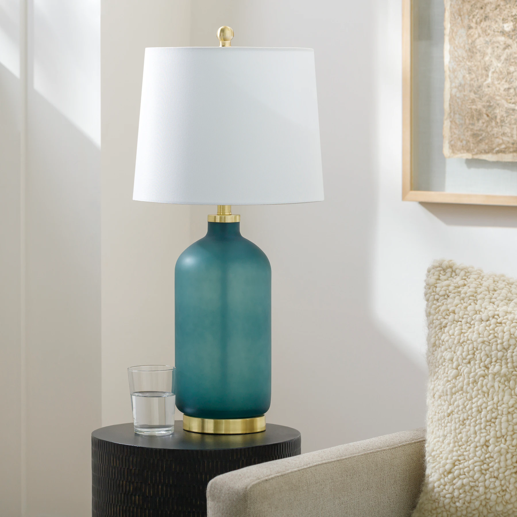 Light up your rooms with the Aegean Table Lamp, featuring a blue frosted glass base, white linen shade and gleaming brushed metal details.