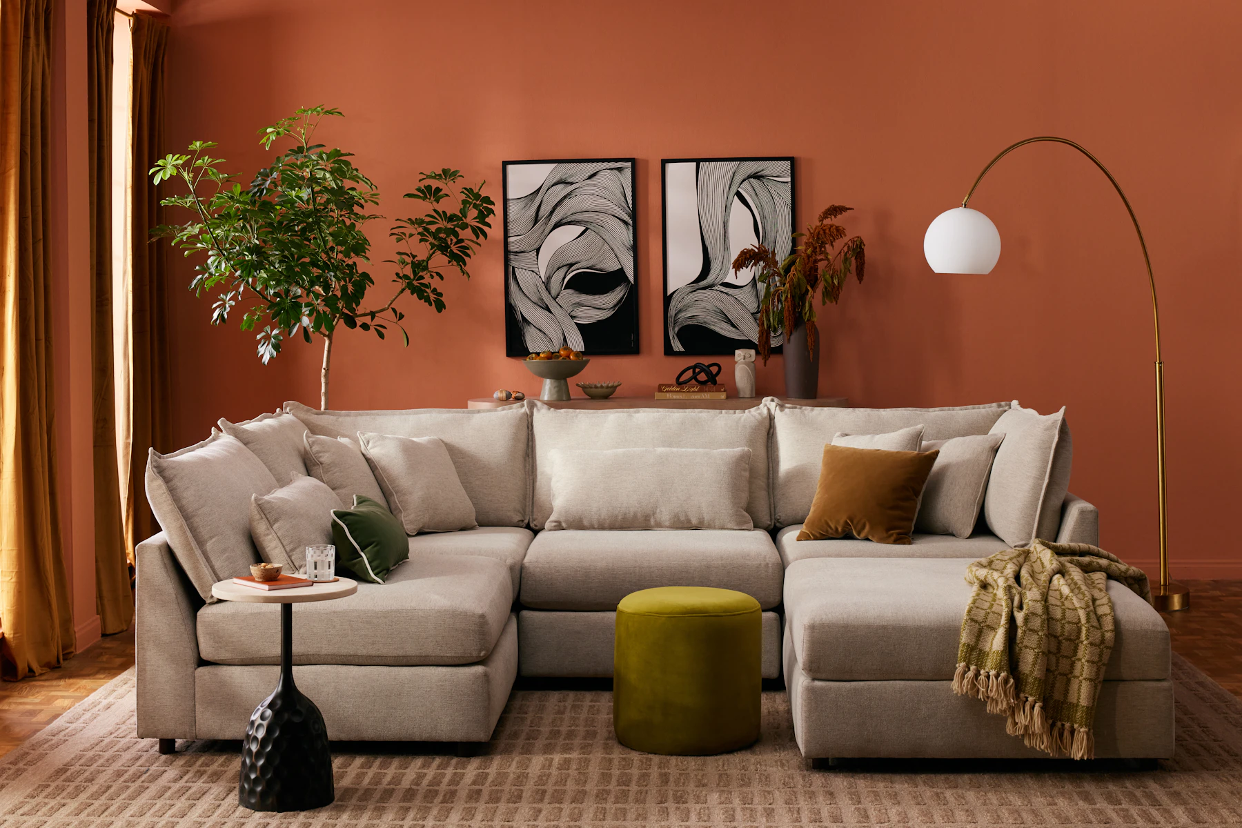 Composed of two armless chairs, two corner chairs and an ottoman, the Tanner U-Sofa Bumper Sectional delivers on style and comfort with its plush cushions, french seam pillowed backings, and assortment of matching accent pillows to boot.