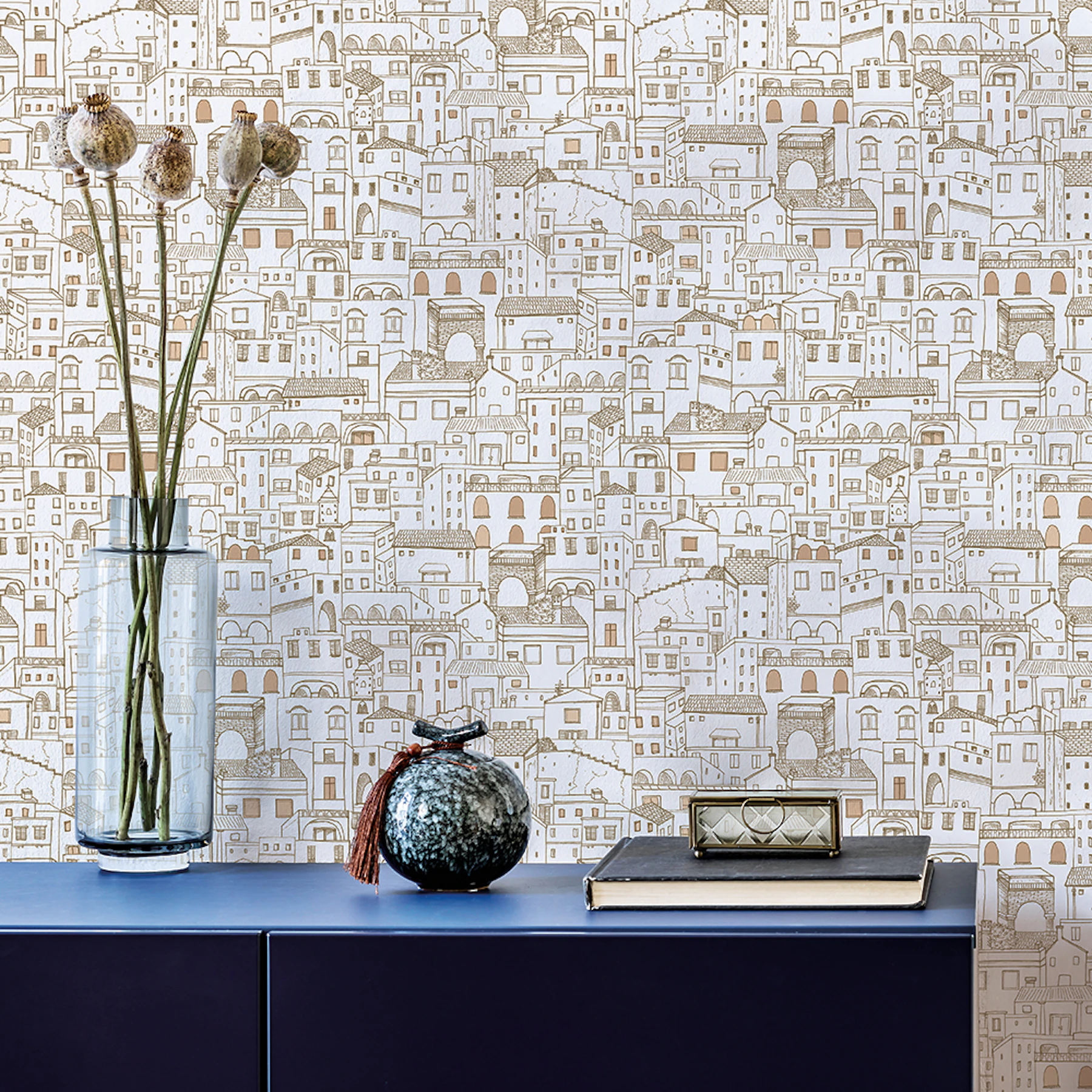Inspired by the plethora of stacked houses in Italy's Amalfi coast, this metallic yet neutral wallpaper brings to life the maze of markets and cafes while transforming your walls.
