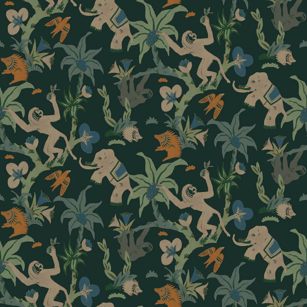 Ready to go bananas? The Jade Jungle wallpaper features a parade of monkeys, elephants and other jungle friends in a deep green shade with pops of blues and oranges for a little fun on your walls.